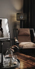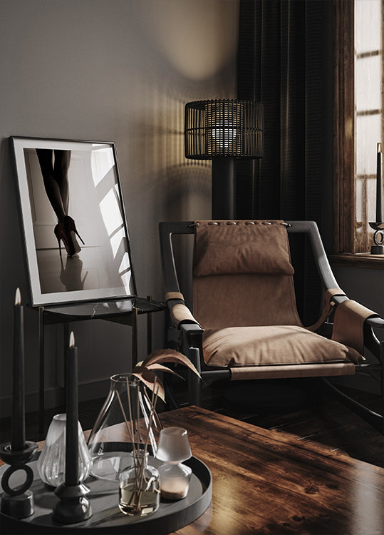 An evocative, desaturated scene at a grand doorway: a poised woman in high heels pauses on a gleaming floor, her silhouette doubled in a soft reflection. Hints of passion and longing charge the air as light spills through the entrance. A romantic, sensual moment captured by artist Erik Schottstaedt.