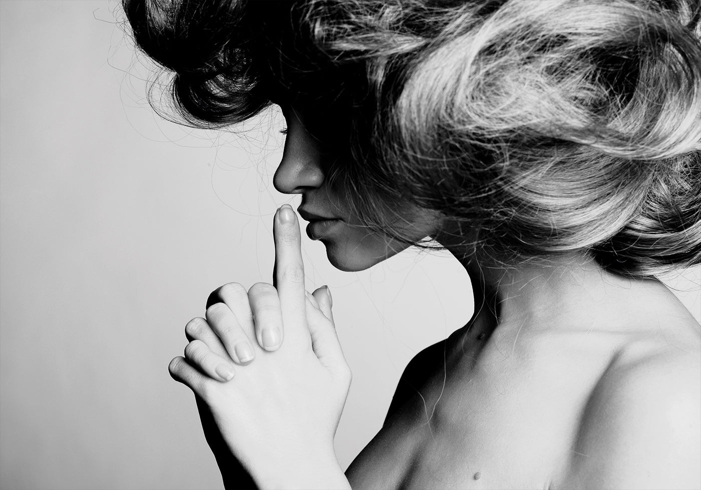 A captivating black and white portrait of a woman with voluminous hair, captured in a moment of introspection. Her delicate pose, with a finger to her lips, evokes a sense of mystery and quiet elegance. The monochrome palette enhances the contrast and texture, adding a timeless and sophisticated feel to the image.