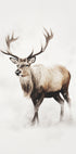 Reindeer In Snow by artist Andreas Magnusson captures a serene Arctic hush: a proud reindeer pauses as soft flakes fall, breath misting in the cold. Cool whites and deep shadows frame its warm coat, while faint hoofprints lead through pines, inviting Nordic calm and a spark of festive wonder. Bring winter magic home.