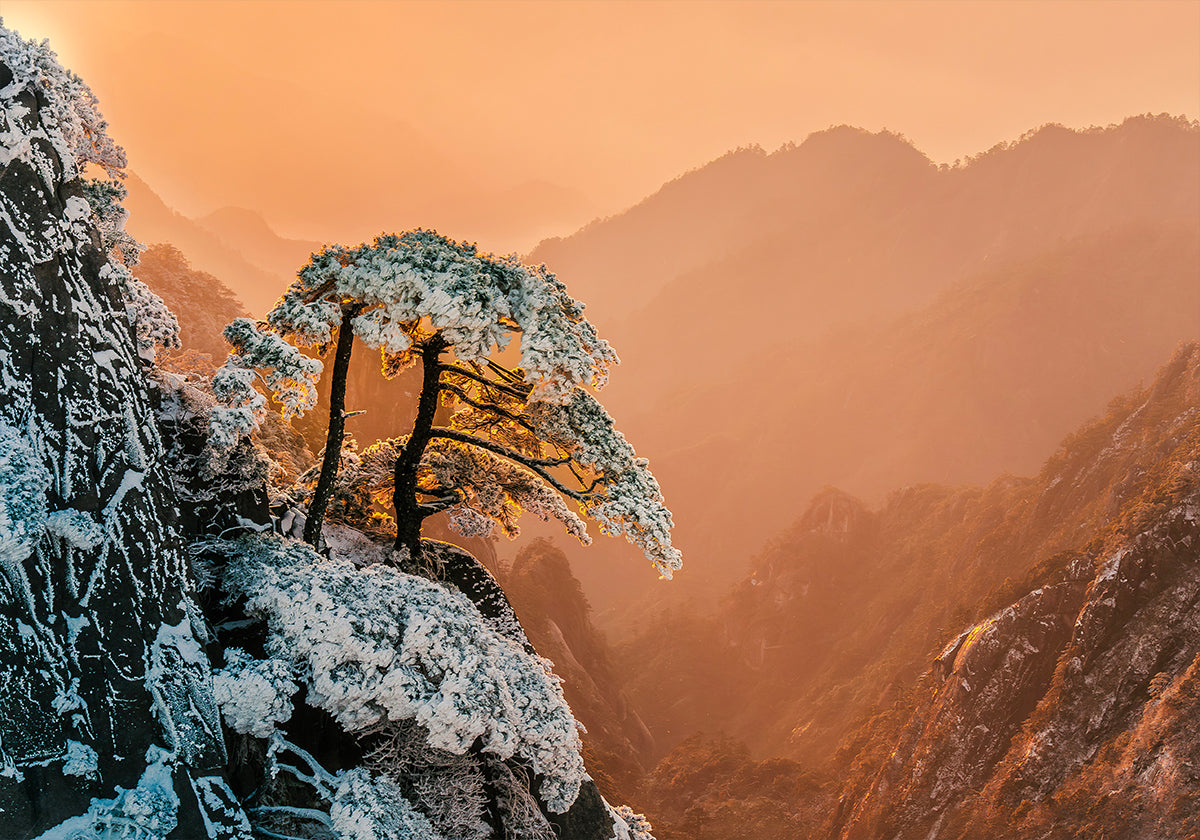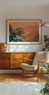 At daybreak, a lone pine clings to a rocky ledge above snow-bright peaks and a frost-laced forest, catching the first blush of sunrise. Icy blues meet warm dawn golds, evoking grit and calm. Resilience on the Edge by artist Wei (David) Dai brings quiet strength to your space. A crisp winter panorama that celebrates endurance.