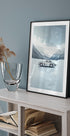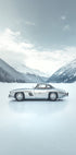 Glide into alpine nostalgia with a retro silver car paused beside a frozen lakeside, mountains rising crisp against a pale winter sky. A poised model brings a touch of ski-lodge glamour, while soft clouds and snow-dusted pines frame the scene—cool, cinematic, and irresistibly vintage. Perfect for winter lovers and classic car fans.