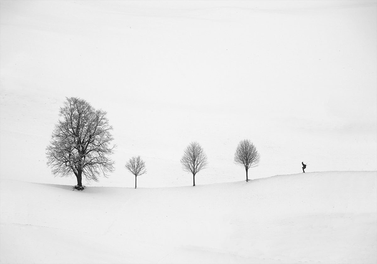 Created by photographer Peter Svoboda MQEP, ‘return as always’ portrays a lone skier sweeping across a vast, high-key snowy slope beneath distant mountain silhouettes. In stark black and white, sparse trees, etched tracks, and luminous frost conjure minimalist drama, quiet momentum, and winter’s graphic calm.