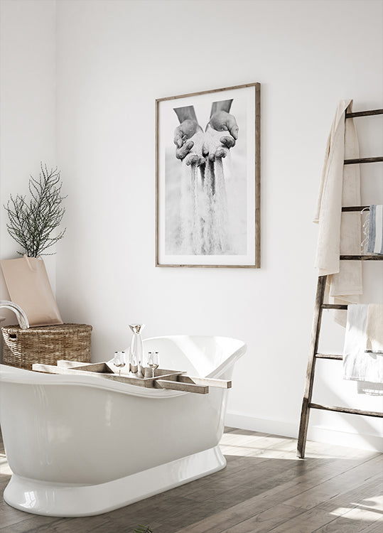 A poignant black-and-white image capturing grains of sand slipping through human hands, symbolizing the passage of time, transience, and the fleeting nature of life. The stark contrast highlights the texture of both the sand and the hands, evoking deep introspection and emotion. Perfect for themes of mindfulness, reflection, or philosophical design projects.