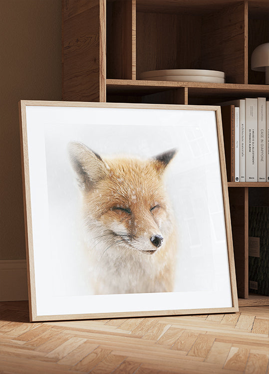 Snow drifts whisper around a fluffy red fox, eyes gently closed and lips curled into a quietly satisfied smile. Frost dusts its whiskers; a pale winter backdrop softens every edge. Doris Reindl captures a moment of woodland calm and playful joy—a serene pause that brings cozy, seasonal warmth to your space.