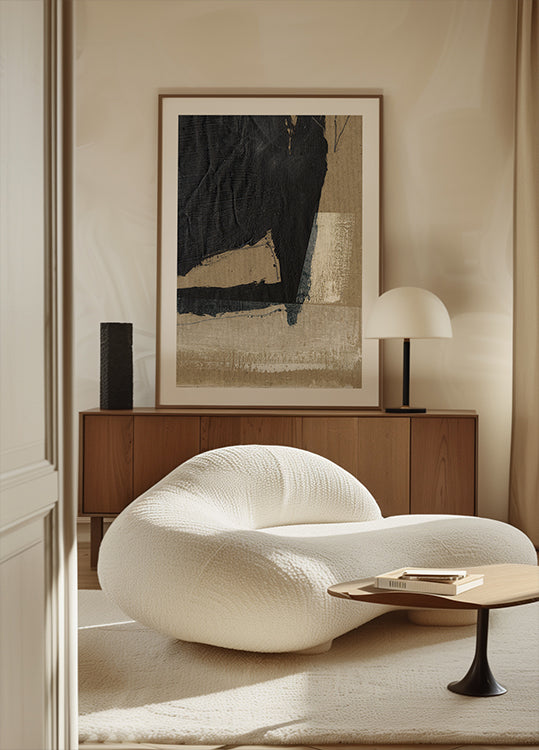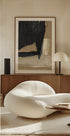 Say It by Dan Hobday presents a contemporary abstract composition in earthy neutrals and painterly strokes. Layered beige and brown fields meet graphic shapes and dark accents, forming a calm yet expressive focal point. Minimal and modern, it adds balanced energy and quiet sophistication to your space.