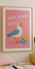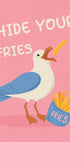 A quirky and humorous illustration of a seagull snatching fries with the playful text “Hide Your Fries.” This colorful poster brings seaside fun and cheeky charm into your home, making it a perfect addition to kitchens, kids’ rooms, or interiors that embrace humor and lighthearted design.