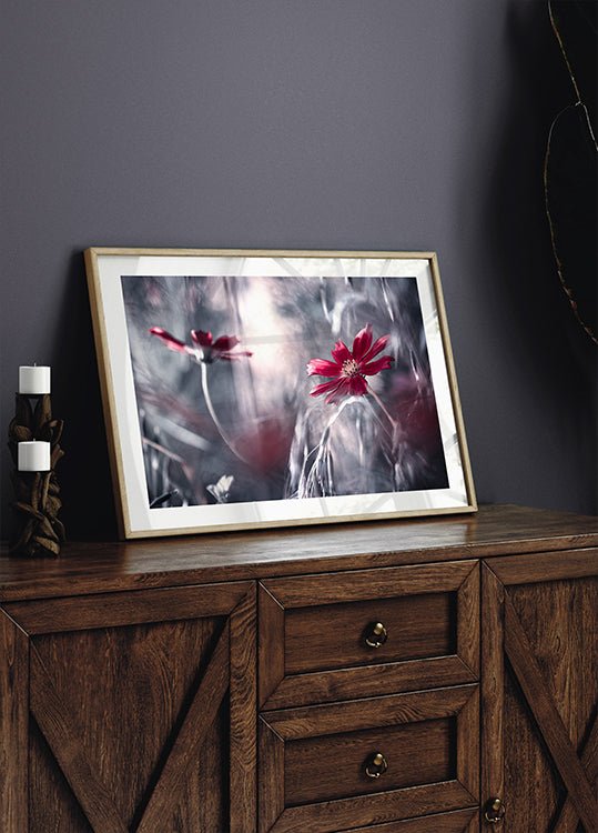 Immerse in the allure of a crimson bloom: velvety petals curl in a sensual close‑up, punctuated by glistening highlights and dreamy bokeh. This intimate botanical study by Fabien BRAVIN captures the hush of a garden moment—romance, mystery, and movement held in a single, seductive frame. A bold statement for modern interiors.