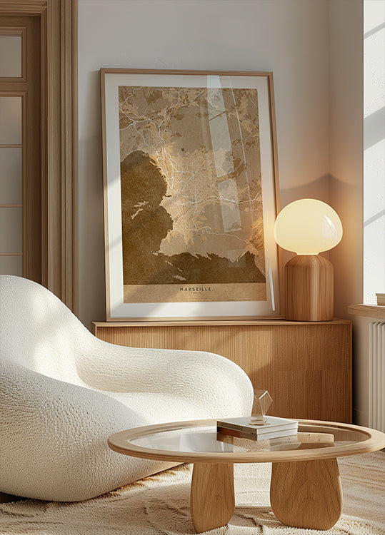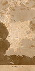 Discover Marseille, France through a sepia-toned vintage map that evokes old-world charm. Fine cartographic lines trace the bustling Vieux-Port, winding streets, grand boulevards, hilltop neighborhoods, and the Mediterranean shoreline, while aged textures and a subtle patina add depth. A tribute to its maritime spirit and storied lanes.