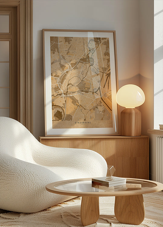 Discover Strasbourg in sepia tones with this vintage-style map: winding streets hug the Ill River, the Petite France quarter unfolds in crisp linework, and the cathedral anchors the city at its heart. Aged textures, elegant type and a classic compass evoke old-world journeys—perfect for lovers of Alsace and timeless cartography.