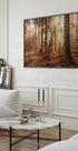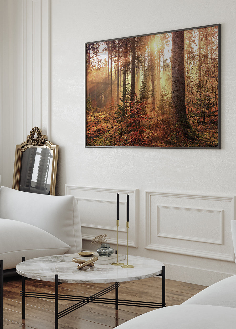 Plakaten viser en fredelig skog med høye trær og myke lysstråler som finner veien gjennom tettheten av skogen. Den varme, gyldne belysningen skaper en rolig atmosfære, mens den fine balansen mellom grønne og røde nyanser i undervegetasjonen gir liv til bildet. Området utstråler stillhet og naturlig skjønnhet.