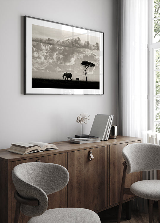 Majestic silhouettes sweep across the Maasai Mara: an acacia crowned horizon, brooding skies, and a tender elephant mother guiding her calf. In striking monochrome, Mario Moreno captures solitude and kinship, a timeless safari tableau where scale, light, and stillness turn the wild into pure graphic poetry.