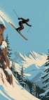 Skier Jumping by Andreas Magnusson captures the rush of alpine flight: a fearless skier launches off a cliff, carving an arc against towering snow-capped peaks. Retro tones and bold, clean lines evoke vintage ski posters, blending motion and minimalism. A striking tribute to mountain energy and winter adventure.