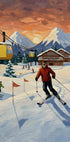 Feel the alpine rush in this vivid scene by HUGO: a lone skier arcs across fresh powder while a blazing sunset paints the sky in amber and violet, casting long, crisp shadows over pine-clad slopes. Chairlifts drift in the distance as motion meets calm, capturing the freedom, chill, and glow of winter twilight.