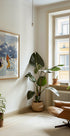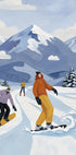 Friends carve across a bright alpine slope, snow spraying as they weave in unison beneath wide, cloud-brushed skies and towering peaks. The scene captures motion, laughter, and crisp mountain calm—freedom shared on a winter run. A contemporary ski adventure artwork by HUGO, alive with energy and camaraderie.