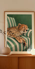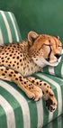 A charming illustration of a cheetah peacefully napping on a striped green armchair. The warm tones of the animal contrast beautifully with the elegant chair, creating a cozy and modern vibe. Perfect for living rooms, bedrooms, or children’s spaces — adding a touch of personality and calm.