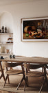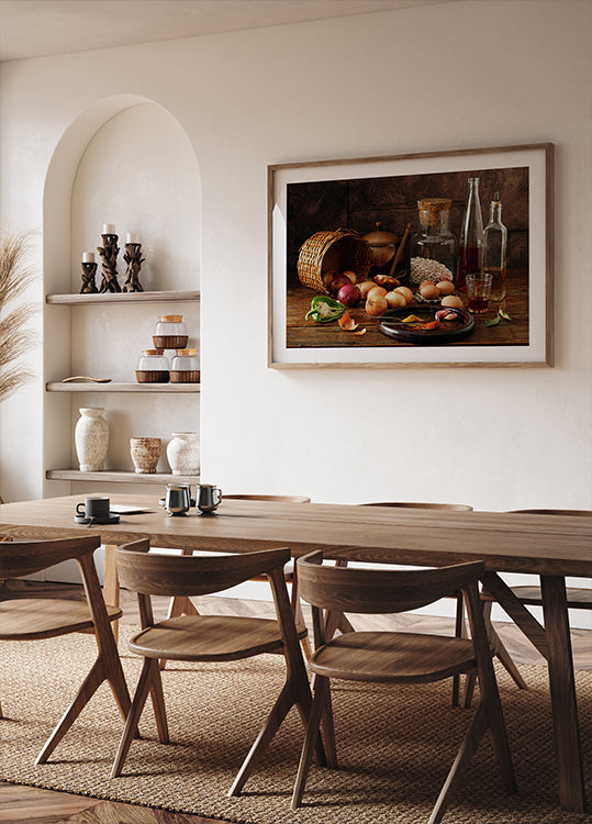 Smells by Luiz Laercio is a rustic still life of a well-loved farmhouse kitchen: glass bottles of olive oil and vinegar, a jar of beans, wine and lemonade, garlic and onions, herbs and peppers, eggs, spoons and a worn plate gathered on a wooden table. Warm, vintage tones and soft light evoke countryside comfort and timeless flavor.