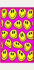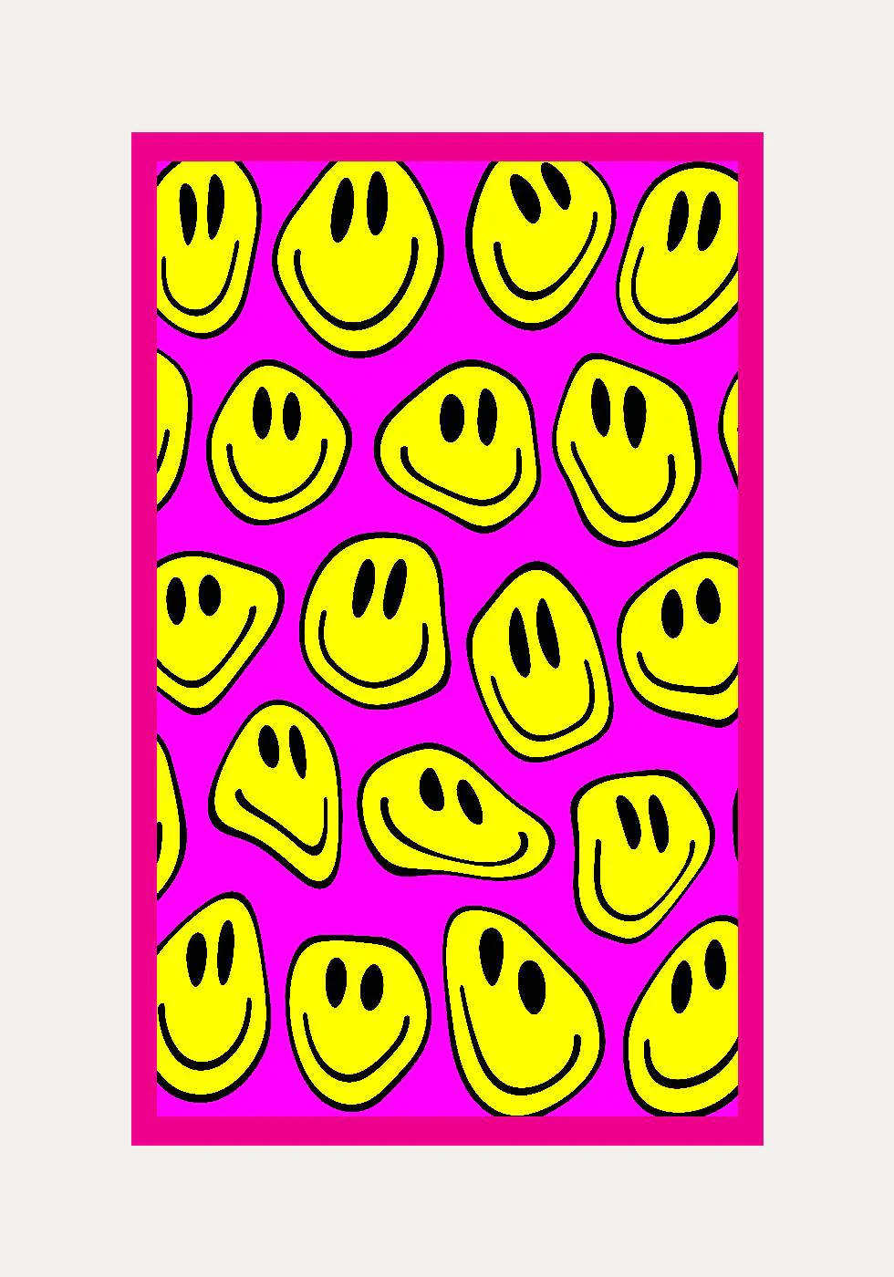 A vibrant and playful pop-art inspired poster featuring a dynamic pattern of wavy yellow smiley faces on a bold pink background. The exaggerated, distorted expressions create a sense of fun and energy, making this artwork perfect for adding a cheerful and retro touch to any space. Ideal for fans of 90s aesthetics, street art, and bold, eye-catching designs.