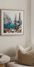 Matt Crowell captures a hushed winter at Moraine Lake: snow-draped peaks rise above frosted evergreens as glacial turquoise water mirrors the rugged skyline. Crisp air, soft light, and subtle greens and whites create a serene, cinematic landscape that brings alpine calm and quiet drama to your space.