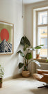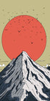 Serene and striking, this minimalist landscape centres on a towering snow-capped peak reminiscent of Mount Fuji, rising above layered valleys under a warm sun. Clean silhouettes, soft gradients, and a quiet flock of birds create a calm, Japanese-inspired mood—perfect for modern spaces seeking stillness and awe.