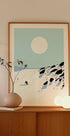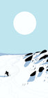 A lone skier carves a clean line down powder-blue slopes under a crisp winter sun. Minimalist shapes, clean geometry, and a cool blue-and-white palette create a serene, modern mood. Echoing retro ski posters, this contemporary scene balances motion and stillness, inviting quiet adventure. Amid sweeping peaks and endless sky.