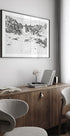 A moody monochrome panorama of jagged, snow-laden peaks towers above a dark pine forest, clouds drifting through a remote valley. Stark light and deep shadow carve the ridgelines, evoking winter silence and frontier vastness of the American West. Photography by Del Mundo Imagery. Perfect for minimalist interiors seeking quiet drama.