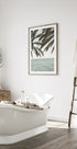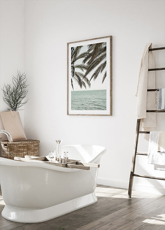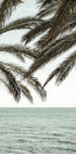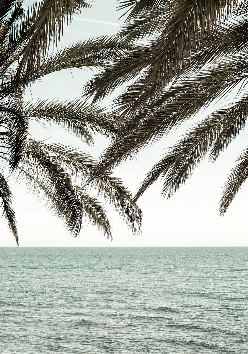 Sunlit calm on a tropical shore: soft sand meets a glassy turquoise sea while palm fronds arc overhead, casting dappled shade across the beach. A luminous horizon glows in warm golds, inviting slow, dreamy escapes and summer reverie. A breezy, modern seascape for serene, coastal interiors. Perfect for daydreamers.