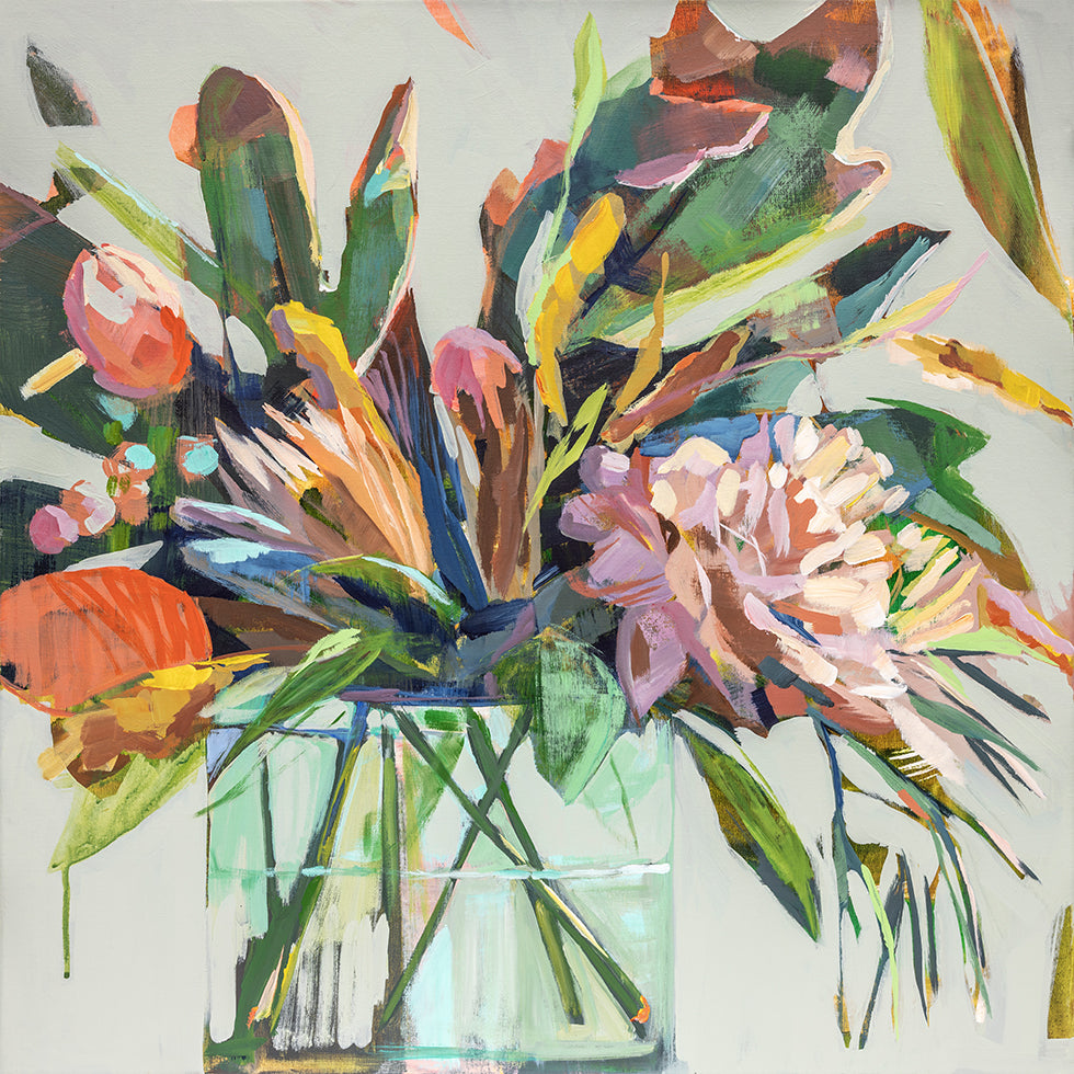 A striking still life by artist Jenny Westenhofer, Spikeybouquet captures a modern bouquet bristling with sculptural, spiky blooms. Painterly strokes and layered shapes create rhythm and depth, balancing sharp forms with soft petals for a bold, contemporary floral statement that enlivens any space. Beautifully.