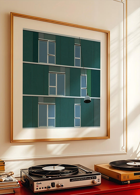 Street lamp by photographer Inge Schuster distills the city into elegant essentials: a lone lamppost slicing across white and soft grey facades with a whisper of pastel green. Clean angles, gentle shadows, and generous negative space orchestrate a calm, contemporary rhythm of urban minimalism. Quiet and refined.