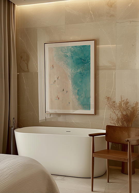 A calming aerial perspective of beachgoers walking along a soft sandy shore as turquoise waves gently lap the coast. This serene summer artwork captures the essence of leisure and lightness, perfect for seasonal decor, beach houses, or modern gallery walls.