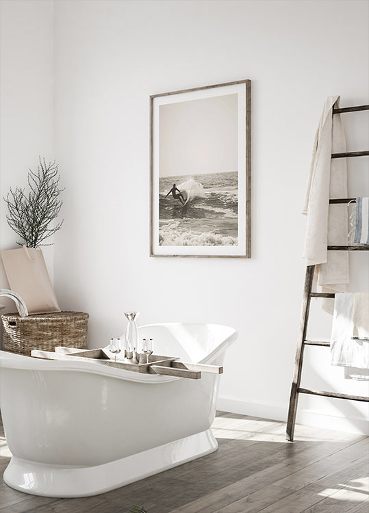 A captivating sepia-toned photograph of a surfer carving through the waves with perfect balance. The ocean’s movement and the dynamic spray of water create an exhilarating yet tranquil moment, embodying the spirit of adventure and freedom. Ideal for surf lovers and coastal home decor.