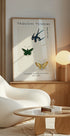 This minimalist Japanese woodblock composition by Taguchi Tomoki captures a graceful swallow mid-flight alongside two detailed butterflies. The delicate lines and striking use of color reflect Edo-period natural studies, blending scientific observation with artistic expression.