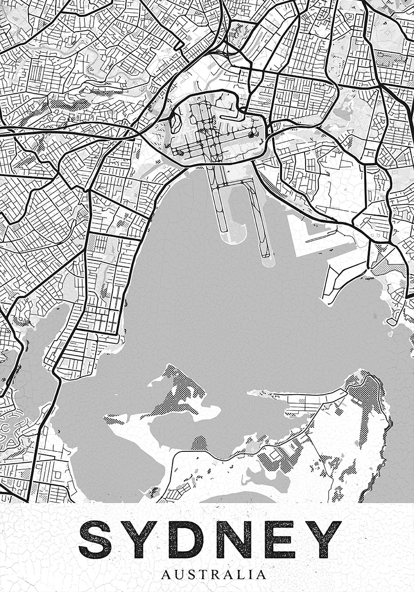Discover Sydney in monochrome with this refined map by StudioSix. Crisp black-and-white lines trace the harbour, bridges, and winding streets, while subtle vintage texture adds a nostalgic, cartographic charm. Minimal typography and clean geometry make a striking focal point for Australia lovers and modern spaces. A timeless tribute to the city’s coastlines and neighborhoods.