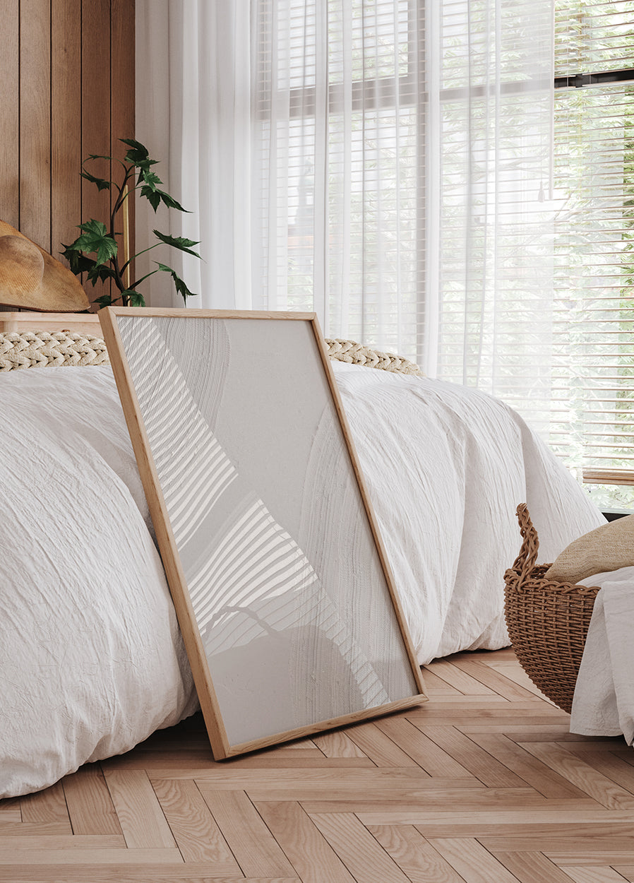 The poster shows a minimalist composition with structured, undulating lines on a light, plain background. The light gray tones provide a subtle contrast and create a tactile sensation. The design provides a modern and stylish atmosphere, perfect for highlighting simplicity and elegance in the interior.