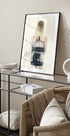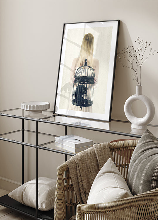 A surreal and thought-provoking artwork featuring a faceless woman with long blonde hair holding a black cage. Inside, a piercing-eyed black cat gazes outward, embodying mystery, entrapment, and hidden meanings. This conceptual composition evokes themes of captivity, identity, and the unknown. A perfect piece for lovers of dark aesthetics, psychological art, and symbolism.