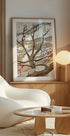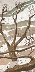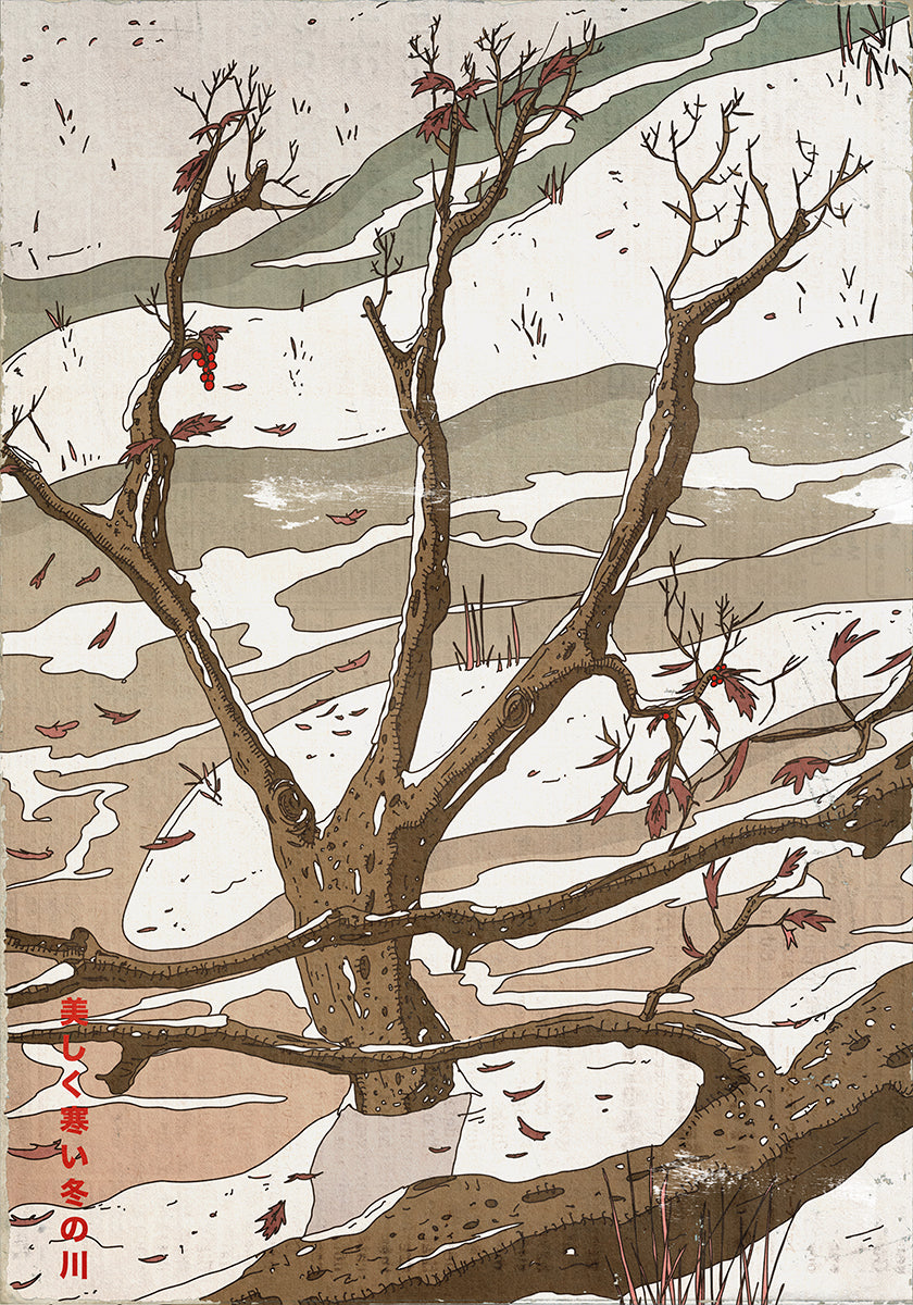 An intimate winter landscape unfolds along a frozen stream: bare trunks and tangled roots lean over icy water, snow dusts muted browns, greens and whites. Minimal linework and soft, weathered tones echo vintage Japanese ukiyo-e prints, shaping a serene, melancholic scene that feels tranquil, timeless, and quietly poetic.