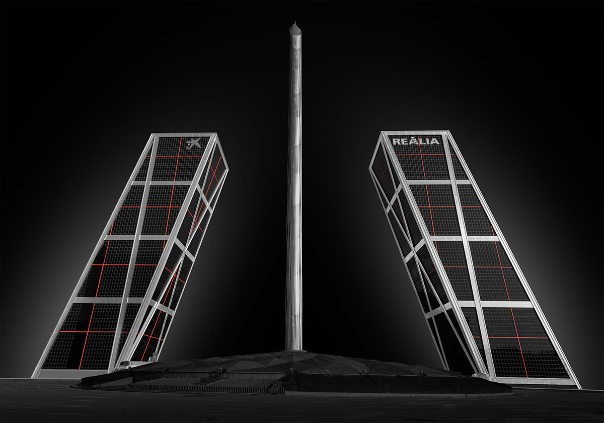 Rodrigo Núñez Buj captures Madrid’s bold skyline in a striking urban study: the leaning KIO Towers rise like twin blades while the red Obelisk slices the sky. Crisp geometry, high-contrast blacks and whites, and a flash of crimson create a cinematic homage to the city’s restless energy and modernist drama.