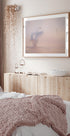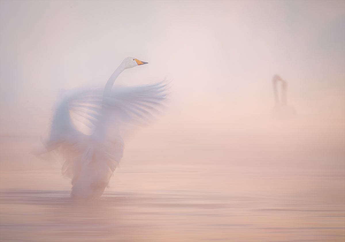 A lone swan cuts through mist above a glassy sea at sunrise, its wings catching blush-pink light while distant water and sky dissolve into haze. Captured by artist Alexandr Kukrinov, this tranquil winter seascape evokes the ache of faraway affection—poised, weightless, and beautifully fleeting. To linger.