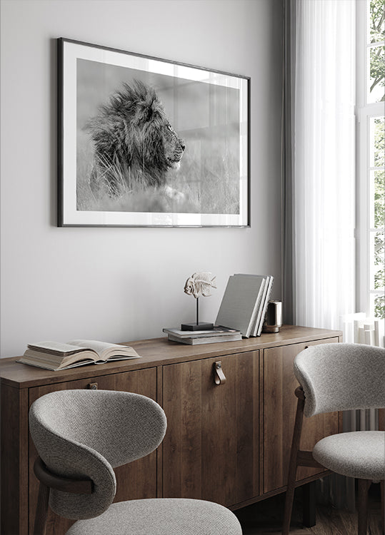 Majestic and solitary, a lion faces the windswept savannah, mane flowing as grasses bow in monochrome hush. The black-and-white composition by Massimo Mei captures strength, stillness, and introspection—an intimate portrait of the wild’s quiet king, poised between power and serenity. A contemplative statement piece for lovers of wildlife.