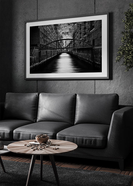 Step into Hamburg’s quiet geometry with this monochrome photograph by Stefan Eisele. Converging façades frame a still canal, stairways and bridges guiding the eye toward shimmering water and sky. Stark lines and subtle textures craft a cinematic urban perspective—poised, timeless, and deeply atmospheric.