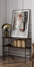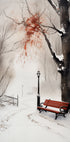 A serene winter scene by Andreas Magnusson: a vivid red bench rests beneath snow-laden trees as soft flakes drift through a quiet park. Subtle watercolour washes and muted tones let the crimson seat glow, inviting calm reflection and festive nostalgia—perfect for cosy seasonal decor and year-round tranquillity.