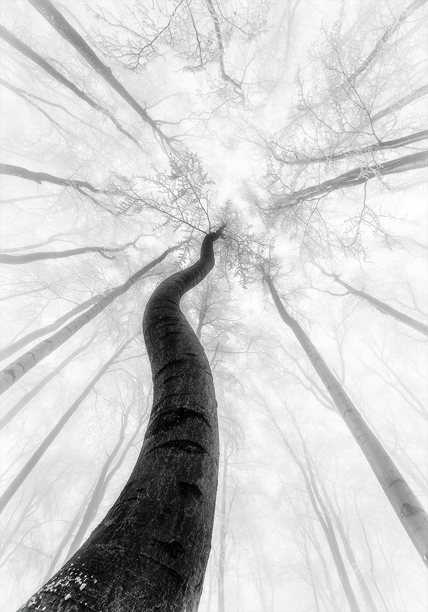 A hush settles over a snowy beech forest as pale trunks fade into a veil of mist. Subtle tones of grey and white carve elegant vertical rhythms, while soft frost blurs the distance into dreamlike calm. The winter stillness is captured with poetic clarity by photographer Tom Pavlasek, perfect for serene, minimalist spaces.