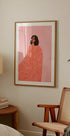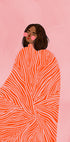 A woman wrapped in a flowing, vibrant orange patterned cloak set against a soft pink background. This modern illustration captures warmth and style with a minimalist and abstract flair, perfect for contemporary art enthusiasts seeking inspiration.
