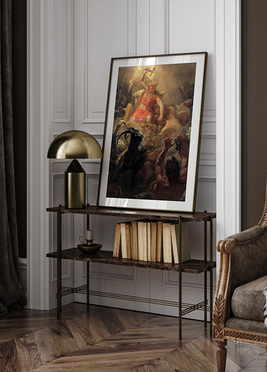 This powerful 19th-century painting by Mårten Eskil Winge depicts the Norse god Thor in the midst of an epic battle against the giants. Wielding his mighty hammer, Mjölnir, Thor is shown in a moment of intense action, his face full of determination and fury as he confronts his foes. The dramatic use of light and shadow, along with the vivid depiction of movement, brings the scene to life, emphasizing Thor's strength and the chaotic struggle between the forces of order and chaos.