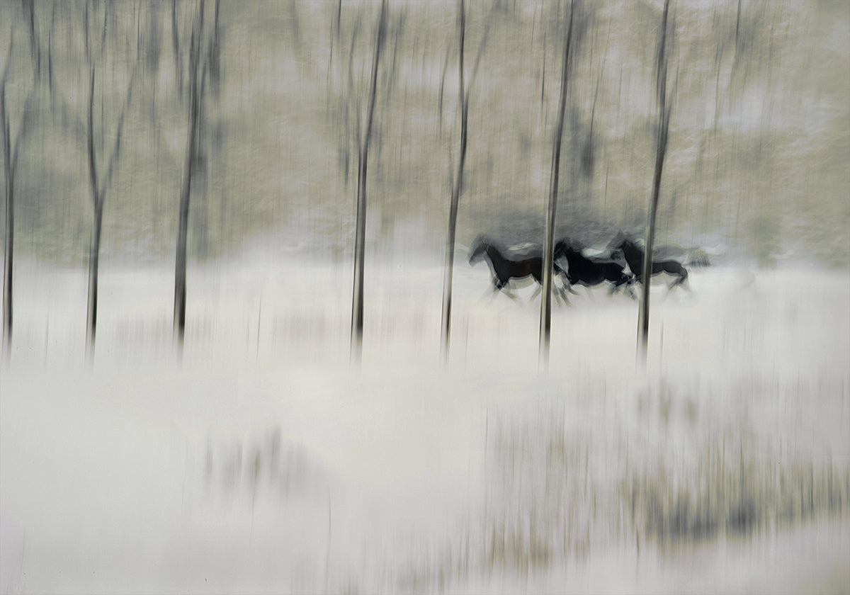 Three ghostlike Lipizzaner horses surge through a snowy haze, their silhouettes blurring into pure motion. In this dynamic winter scene by photographer Milan Malovrh, speed and grace collide—manes flying, hooves skimming frost—as the trio gallops in unison, carving bright trails across the white. A wintry snowfield.