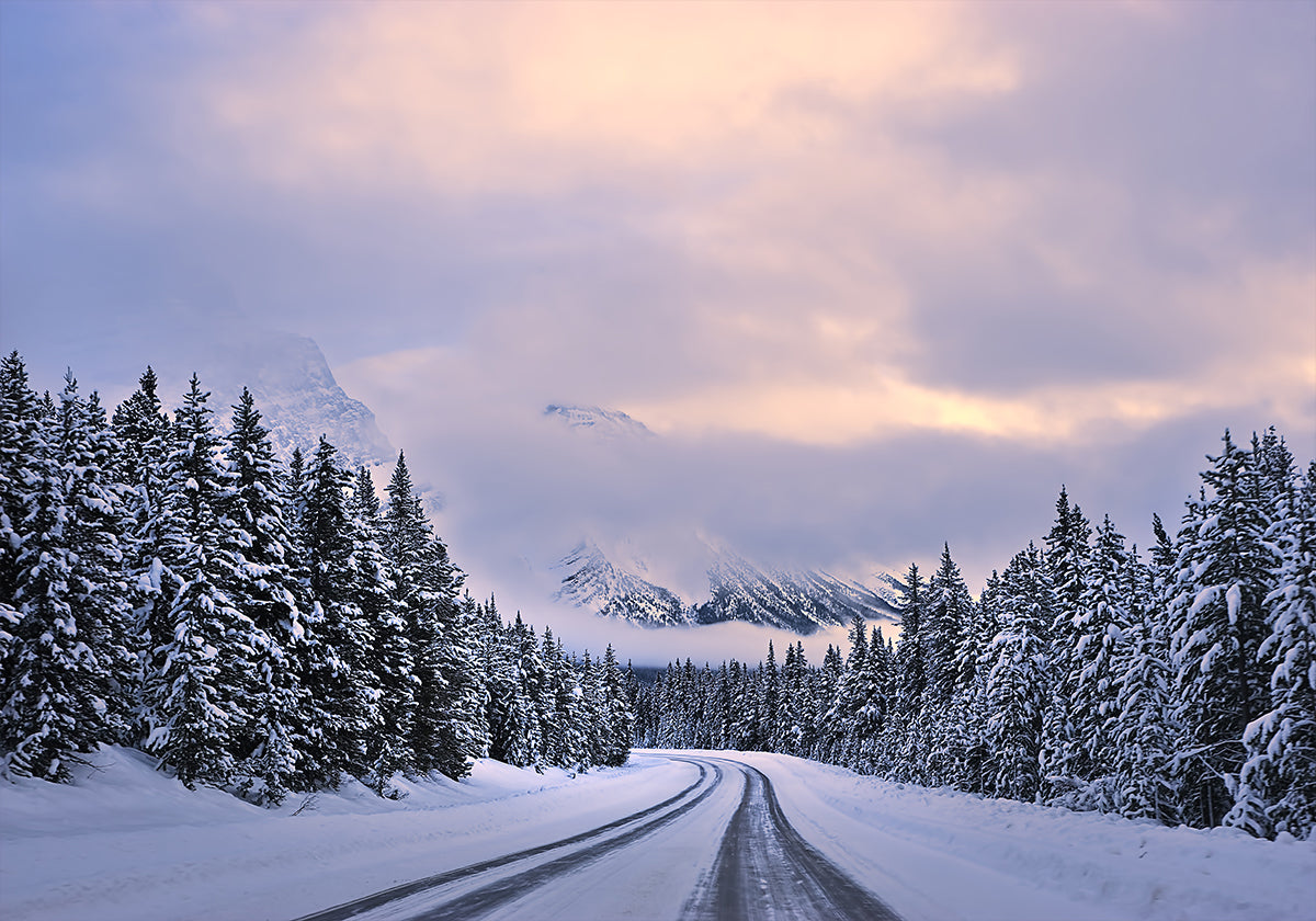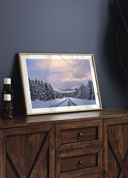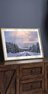 Disappear into a wintry dreamscape as a lone road slips through mist-laden firs toward towering, snow-dusted peaks. Soft clouds veil the Rockies in hushed light, inviting quiet adventure. To the Wonderland by artist Mei Xu captures the serene pull of wilderness, where fog, forest, and mountain meet.