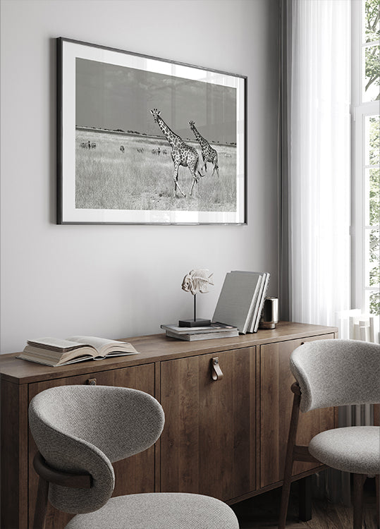 Mathilde Guillemot’s Tourists Spend captures a monochrome safari tableau where tall giraffes and striped zebras share the savannah. Long necks tilt in quiet vigilance, stripes blur into grassland patterns, and the open plains breathe distance, evoking calm, curiosity, and wild grace. Shot in elegant black and white.