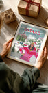 Glide into Gstaad with this painterly travel scene by Caroline Bonne Müller: a confident skier in a bold pink mono suit and mirrored goggles surveys snow-dusted chalets, tall pines, and sunlit Alpine peaks. Crisp vintage-style lettering completes a chic snapshot of Swiss winter glamour. A poster to frame the thrill of après-ski chic.