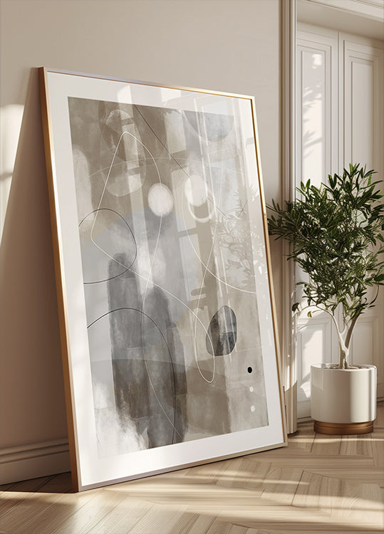 A dynamic abstract composition where sweeping twists of line and shape collide with painterly textures and color splashes. Geometric forms interlock in rhythmic motion, creating depth, energy, and a striking focal point for contemporary spaces. An expressive piece from Pictufy Studio II. Ideal for modern, minimalist interiors.