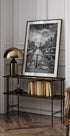 Melanie Viola’s monochrome cityscape captures the timeless charm of Amsterdam along the Oude Schans. Bicycles line the canal, houseboats rest on still water, and the Montelbaanstoren rises beneath brooding clouds. A moody, elegant portrait of urban rhythm where history, reflections, and quiet motion meet.