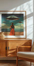 Enter a sunlit dream where retro UFOs drift above a tranquil shoreline. In this surreal digital collage by artist Samantha Hearn, a lone figure gazes seaward as pastel skies melt into ocean blues. Vintage sci‑fi energy meets beach‑day nostalgia, blending wonder, mystery, and summer calm. A playful ode to retro space dreams and coastal escape.